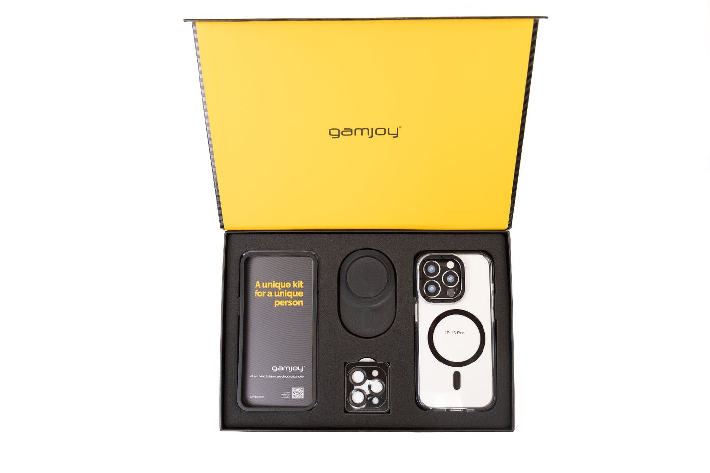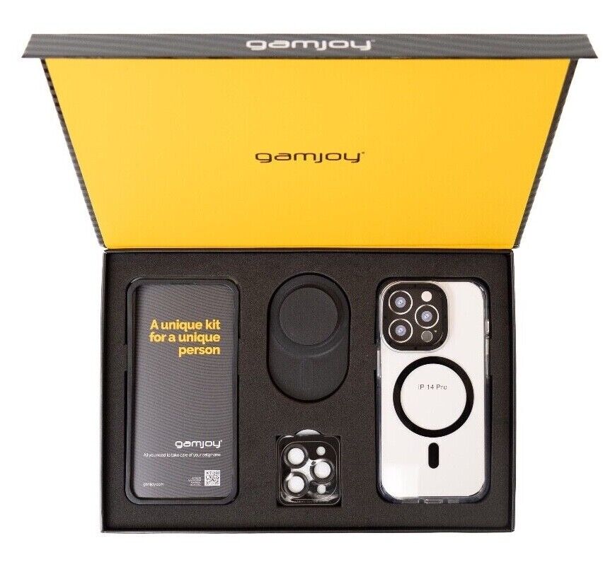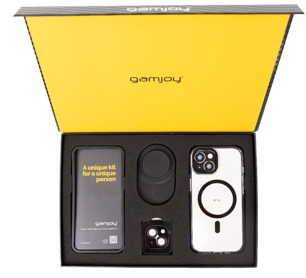 Gamjoy Elegance Kit iPhone 14 15 Pro Max Magsafe Clear Case Stand Tempered Glass Gift Box